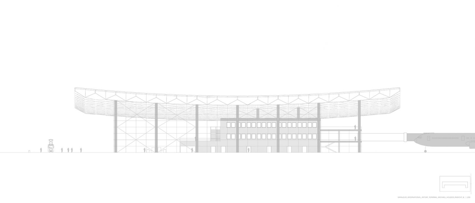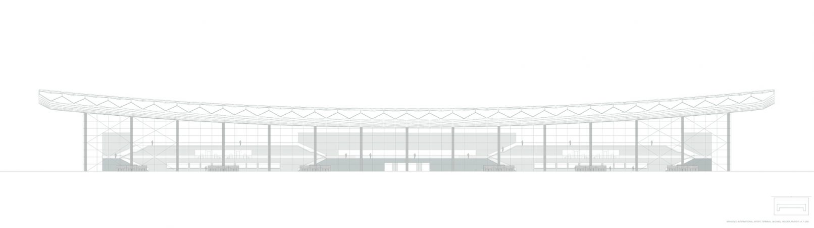 Das charakteristische, geschwungene Holztragwerk mit seiner ETFE-Eindeckung, scheint über dem Terminalgebäude zu schweben. Dieses wurde parametrisch entworfen, mit Galappergos und Karamba auf einen geringen Materialverbrauch, sowie eine hohe Tragfähigkeit optimiert.