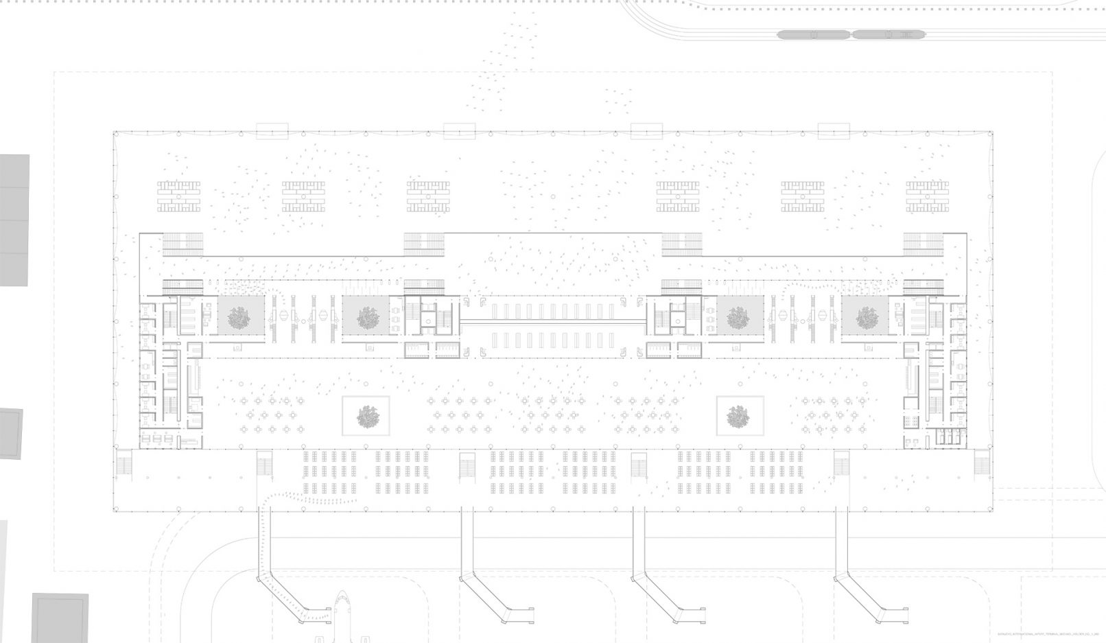 Die Haupteingänge des Gebäudes befinden sich im Erdgeschoss. Direkt nach dem Betreten des Gebäudes, besteht die Möglichkeit eines automatisierten Check-In, sowie die Abgabe des aufzugebenden Gepäcks. Dies ist ein sicherheitsrelevanter Aspekt, da sich die Fluggäste ab diesem Punkt nur noch mit dem Handgepäck weiter bewegen.