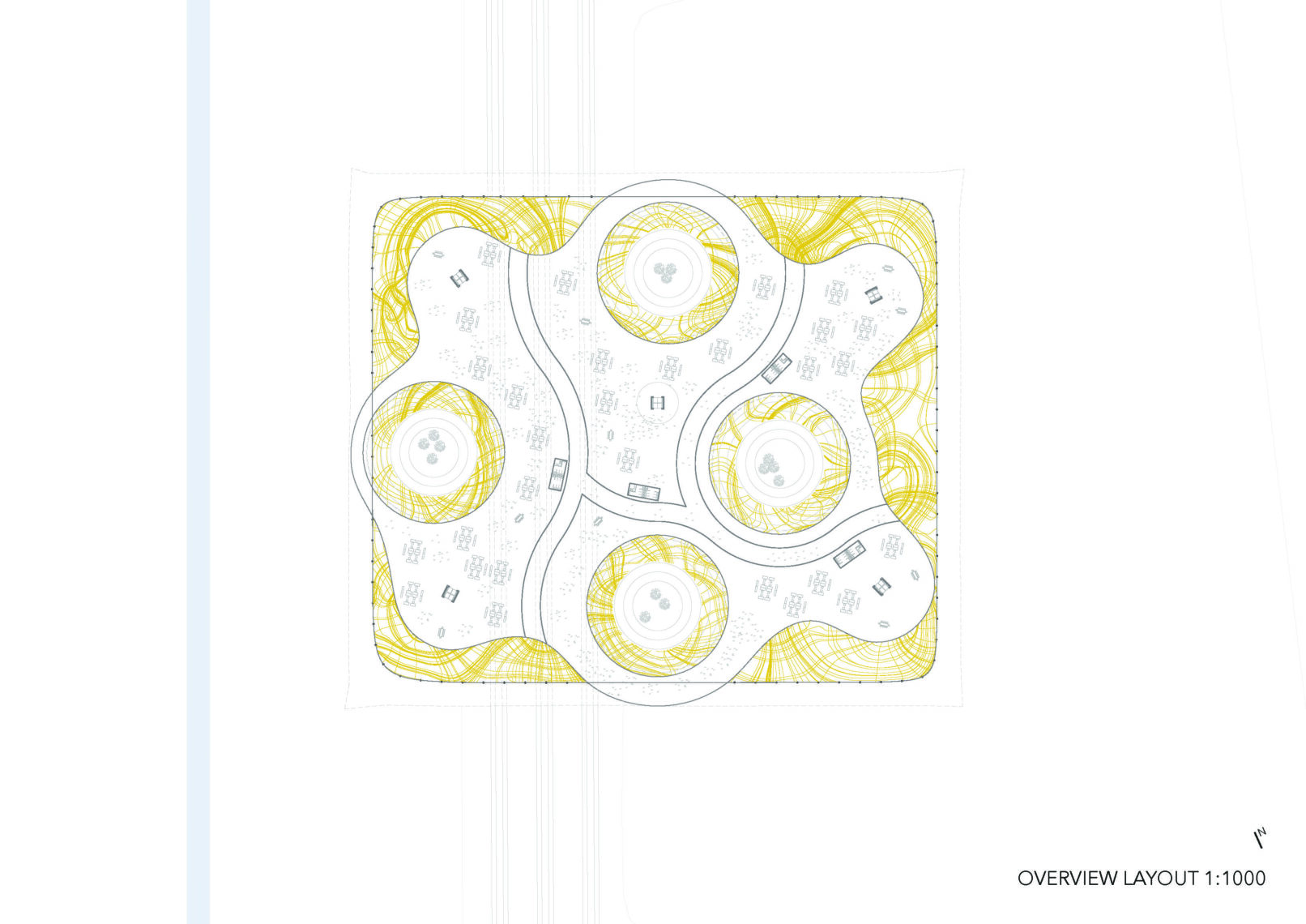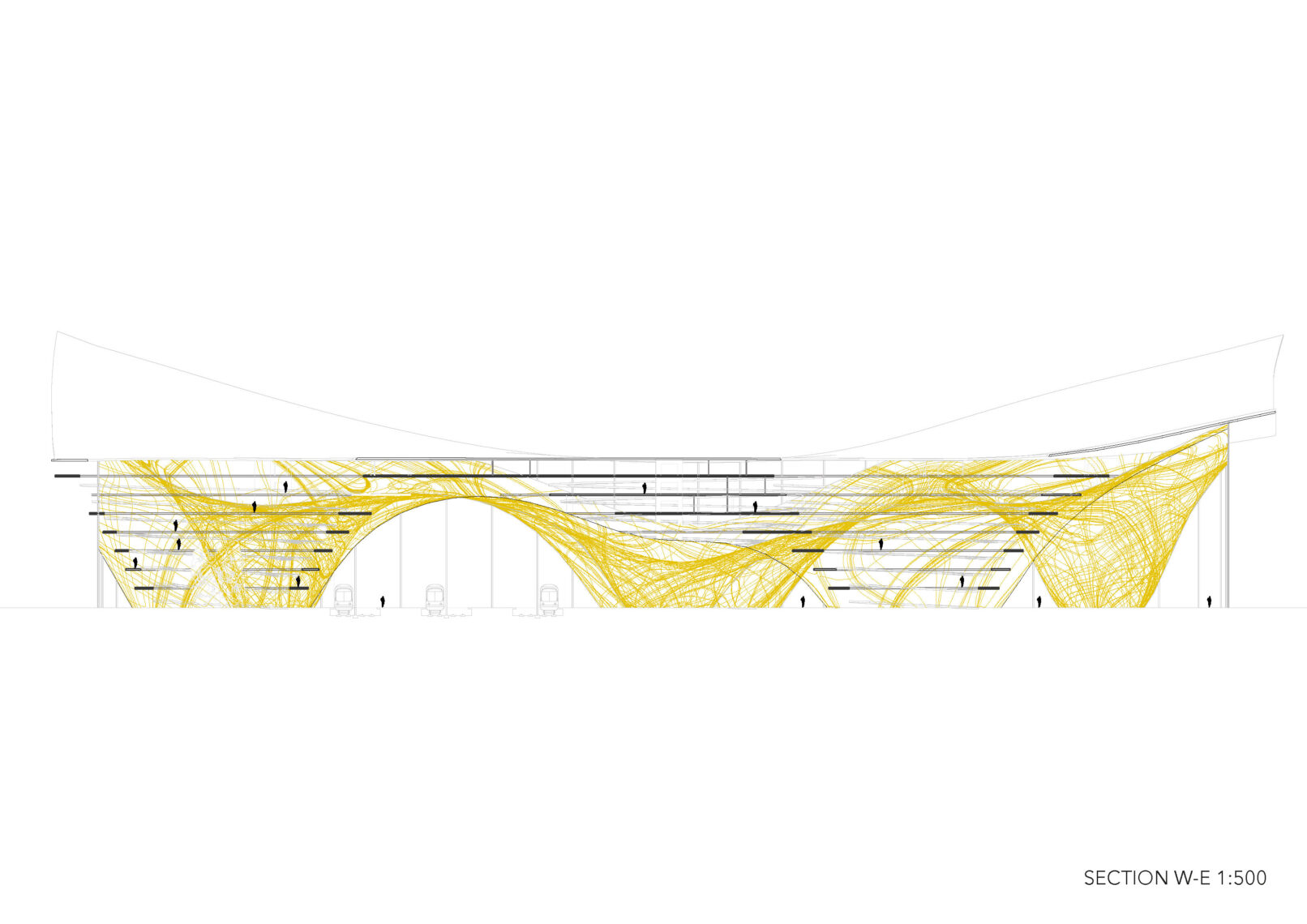 The underlying concept for this design is the idea of elevating the classical train station form, a tube, into three-dimensional space. Through the targeted distribution of the support points of the three-dimensional system, an organic vault is created, which aims at a clear routing, creates public areas and squares and clearly defi nes the space of the train station’s hall. The supporting structure is calculated parametrically so that the load can be derived from a structure that is as fi ligree as possible.
